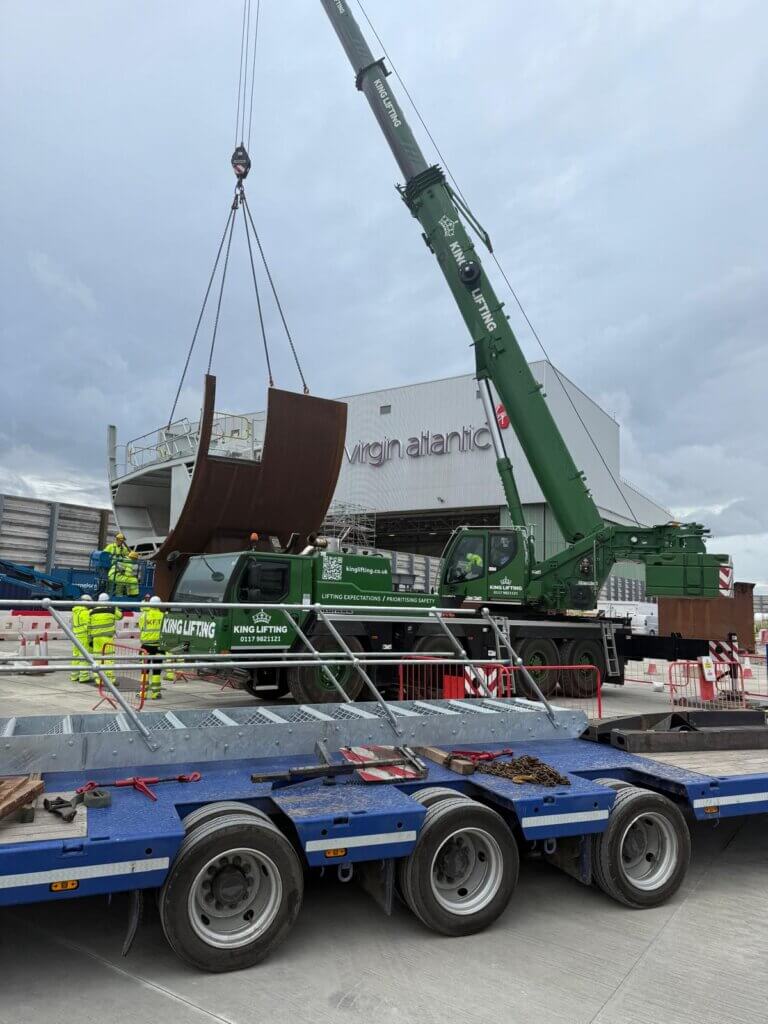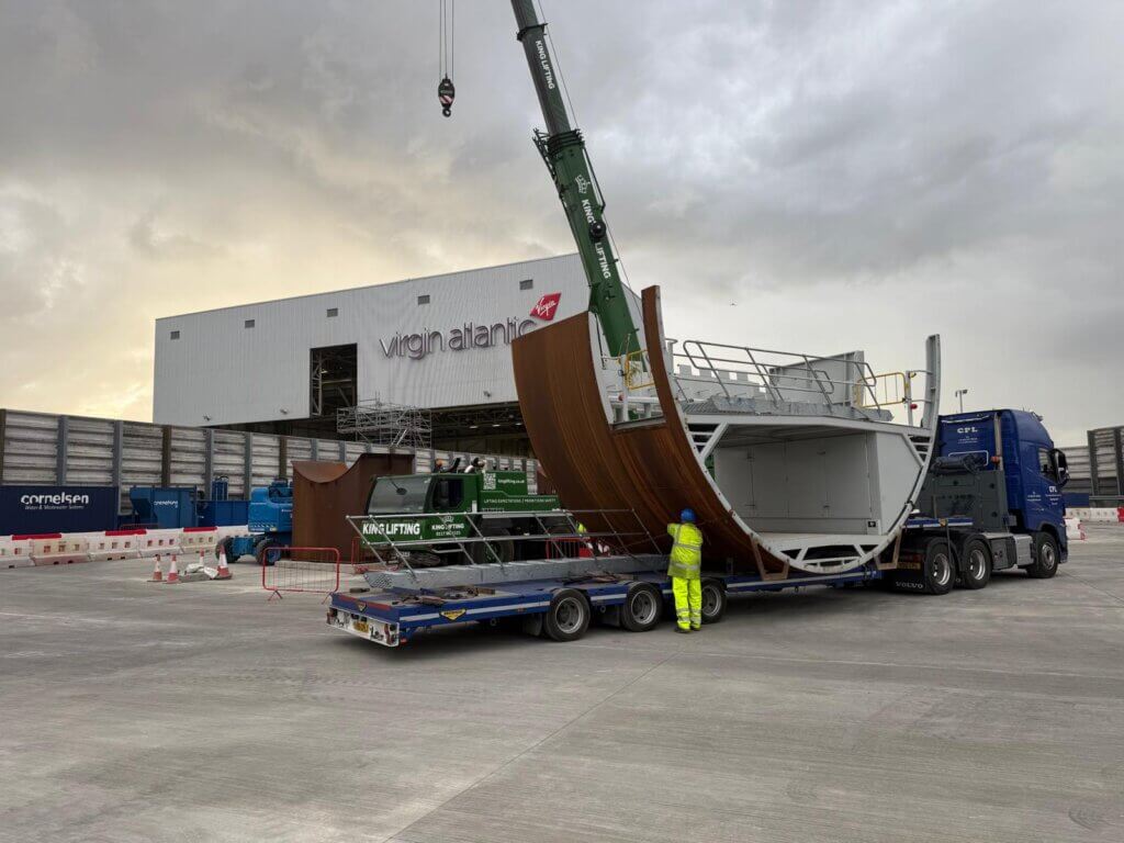 In parallel, we worked closely with Heathrow’s security teams to ensure full compliance with airside protocols, coordinating driver clearances, vehicle approvals and escorted movements. The offloading operation required further precision, as the aircraft sections could not be placed on the ground and instead had to be lifted directly from the trailers onto the structure. Transport and lifting operations therefore had to be carefully synchronised to ensure each load arrived in the correct sequence for assembly.